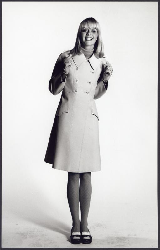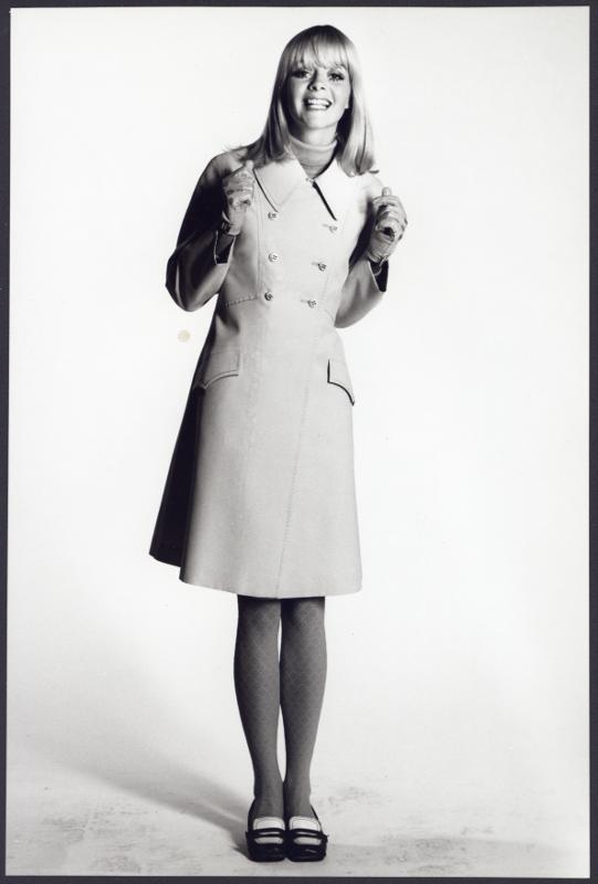- Svartvit bild, kvinna i ljus jacka med ljusa knappar. Hon har ljusa läderhandskar och svartvita skor. Hon har böjda armbågar med händerna mot axlarna.