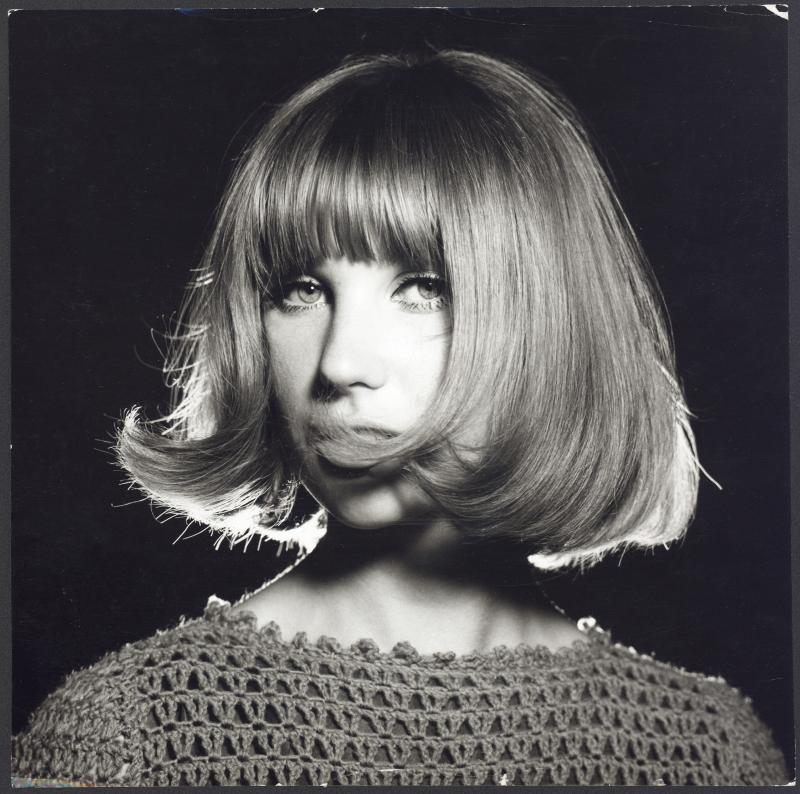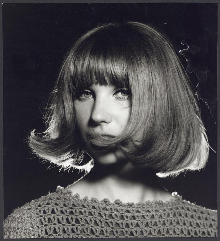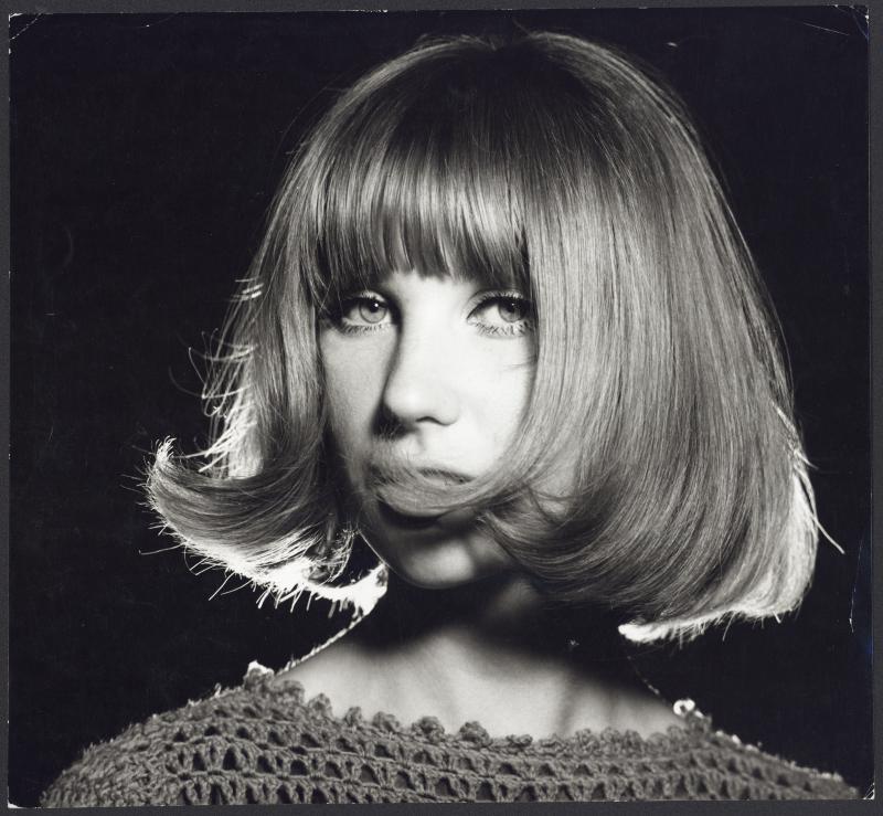 - Svartvit bild, kvinnas ansikte och axlar. Hon bär en mörk stickad tröja med hålmönster. Hon har kort utsläppt hår. Huvudet är vändt till vänster och ögonen tittar in i kameran.