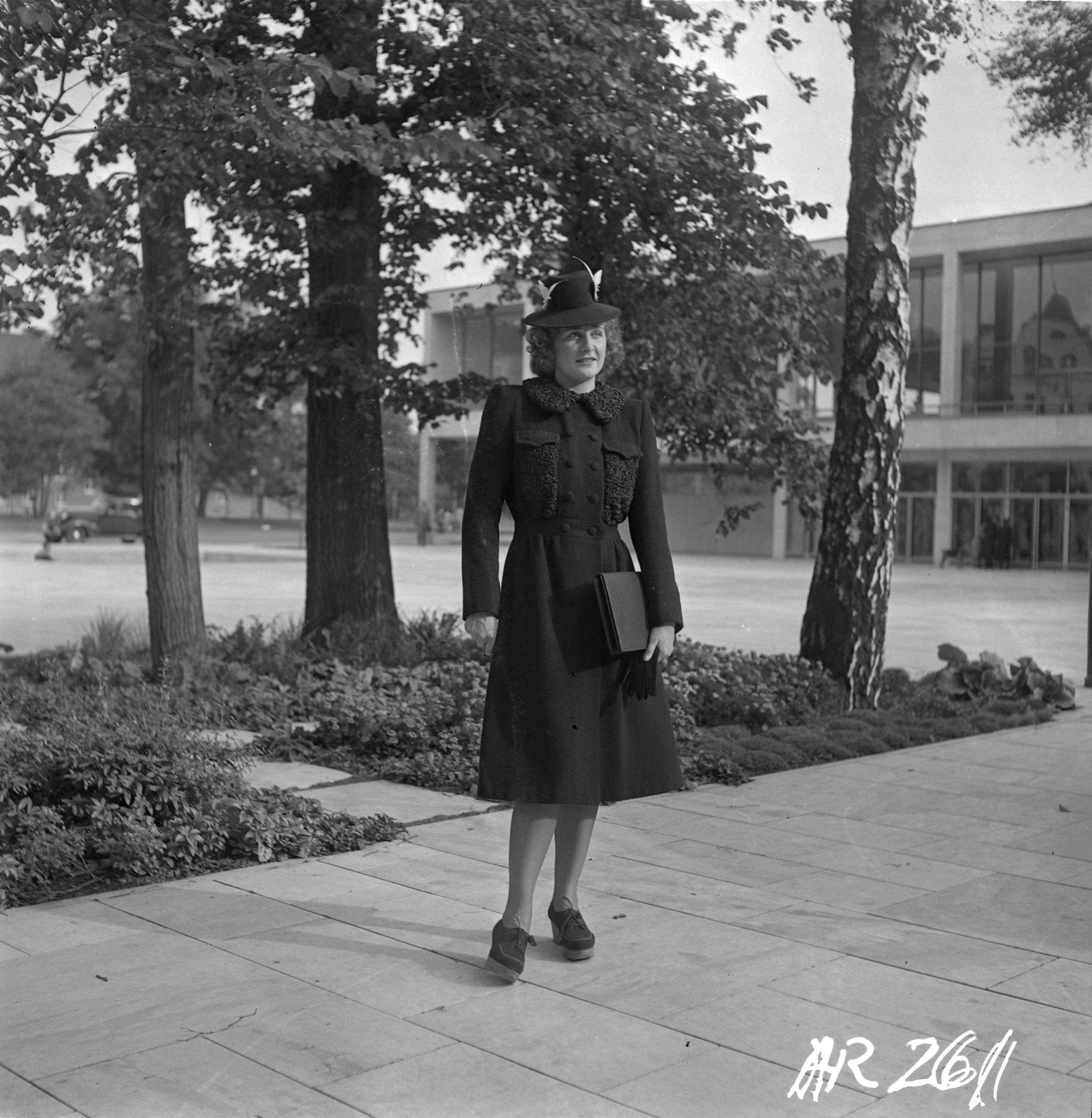 Dir. Jeppsson Fougstedts - kvinna i elegant kappa, ext. (vid teatern, ej färdig) handväska, hatt
