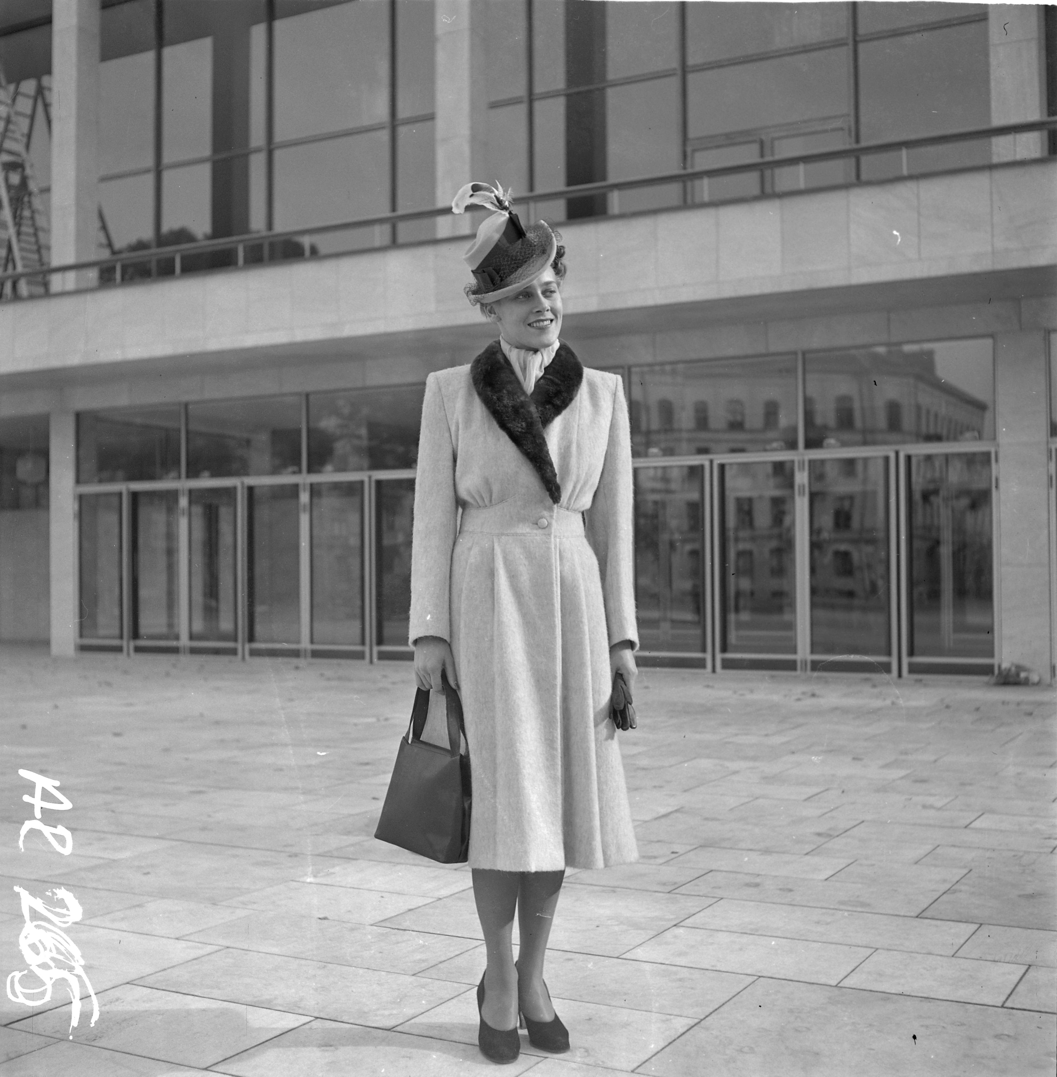 Dir. Jeppsson Fougstedts - kvinna i elegant kappa, ext. (vid teatern, ej färdig) handväska, hatt