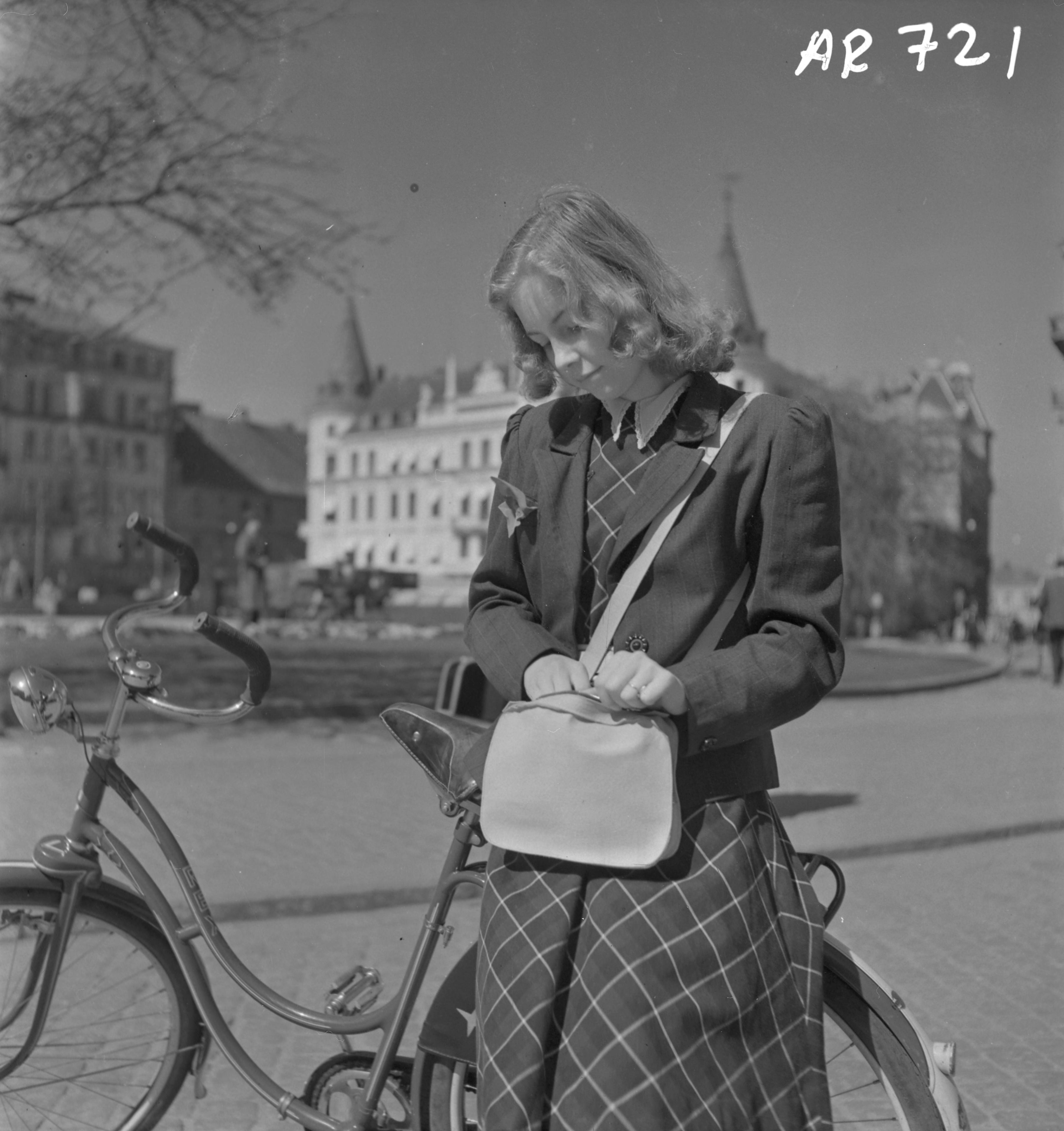 AR 000721 :: kvinna, cyklist, cykel, väska