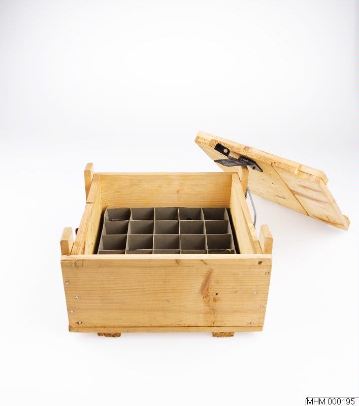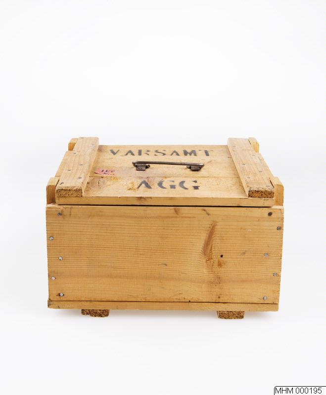 Äggtransportlåda av trä med lock. På locket finns texten "VARSAMT ÄGG" stämplat. Inne i lådan finns en fackindelning av kartong.
