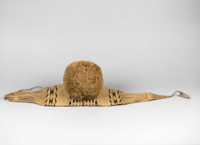Skärp flätat av bast med ornament i svart och påsatt stubbsvansprydnad.