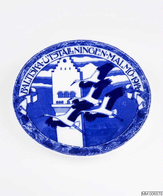 Tallrik (2 st) av porslin med blå dekoration, kring kanten bård av tall och kottar, i mitten utställningstornet och flygande storkar över band med inskrift: Baltiska Utställningen Malmö 1914; å ena tallriken dessutom signatur:
