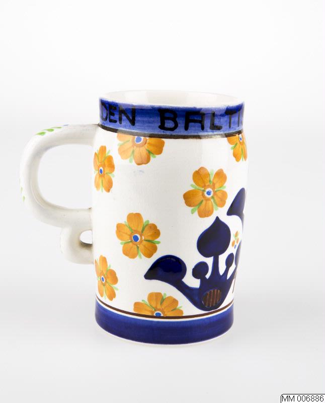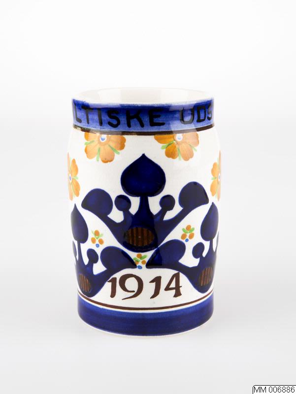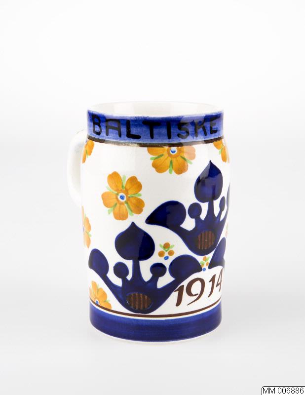 Mugg av fajans med grepe, kring övre övre ô nedre kanten blå rand, i den övre inskrift: "Den baltiske Udstiling"