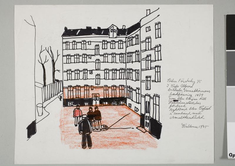 Vi befinner oss på gården till Södra Förstadsgatan 45. T.h. syns gårdssidan av huset sträcka sig in mot bildens mitt där ett gårdshus ansluter i 90 graders vinkel. Husraden är fyra våningar hög och har två dörrar mot gården. I vänster bildkant syns hörnan på ett annat hus och ett gångstråk längs planket till granntomten. I bildens förgrund syns ryggtavlan av en man och längre in på gården tre män på rad vända mot honom. Denna mittre del av bilden har fått en röd ton av vaxkrita, resten av bildytan är obemålad linjeteckning med spritpenna.