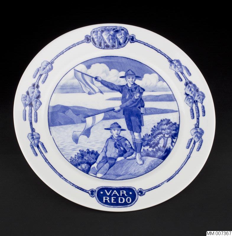 Tallrik av porslin med blå dekor på vit botten.