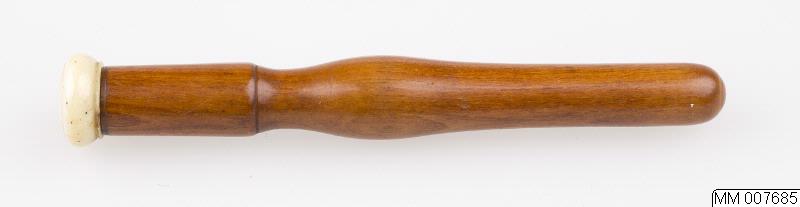 Nåletui av svarvat trä med skruvlock av ben. I etuiet låg en kombinerad örslev och tandpetare i snidat ben.