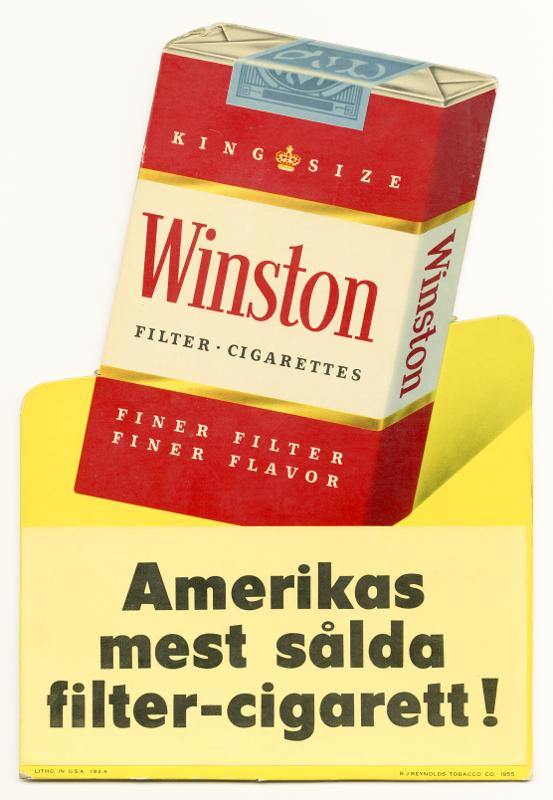 Reklamskylt för cigaretter (Winston filtercigarettes), kartong med utfällbart stöd på baksidan. Röd/vit cigarettask mot gul bakgrund. Reklamtext: Amerikas mest sålda filter-cigarett.