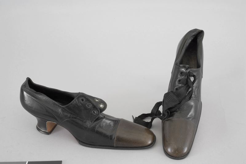 Snörsko i mjukt svart skinn med svängd klack och kångsmalt fotparti. Snörning med brett band i konstsiden.Ena skon stämplad i sulan med krönt S & L. Andra skon Jönsson och klisteretikett i rött och guld: Skomager Lauget Kjöbenhavn.