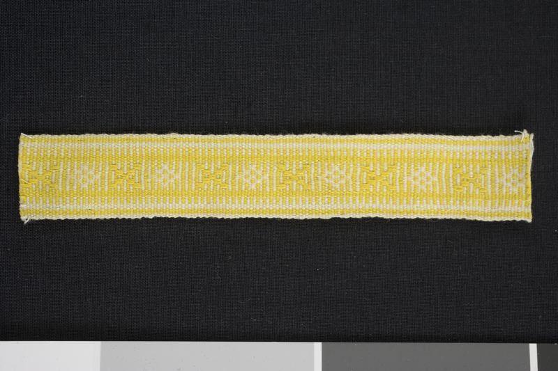 Band, vävt av gult och vitt bomullsgarn. Mönster med rutor, kryss och ränder.