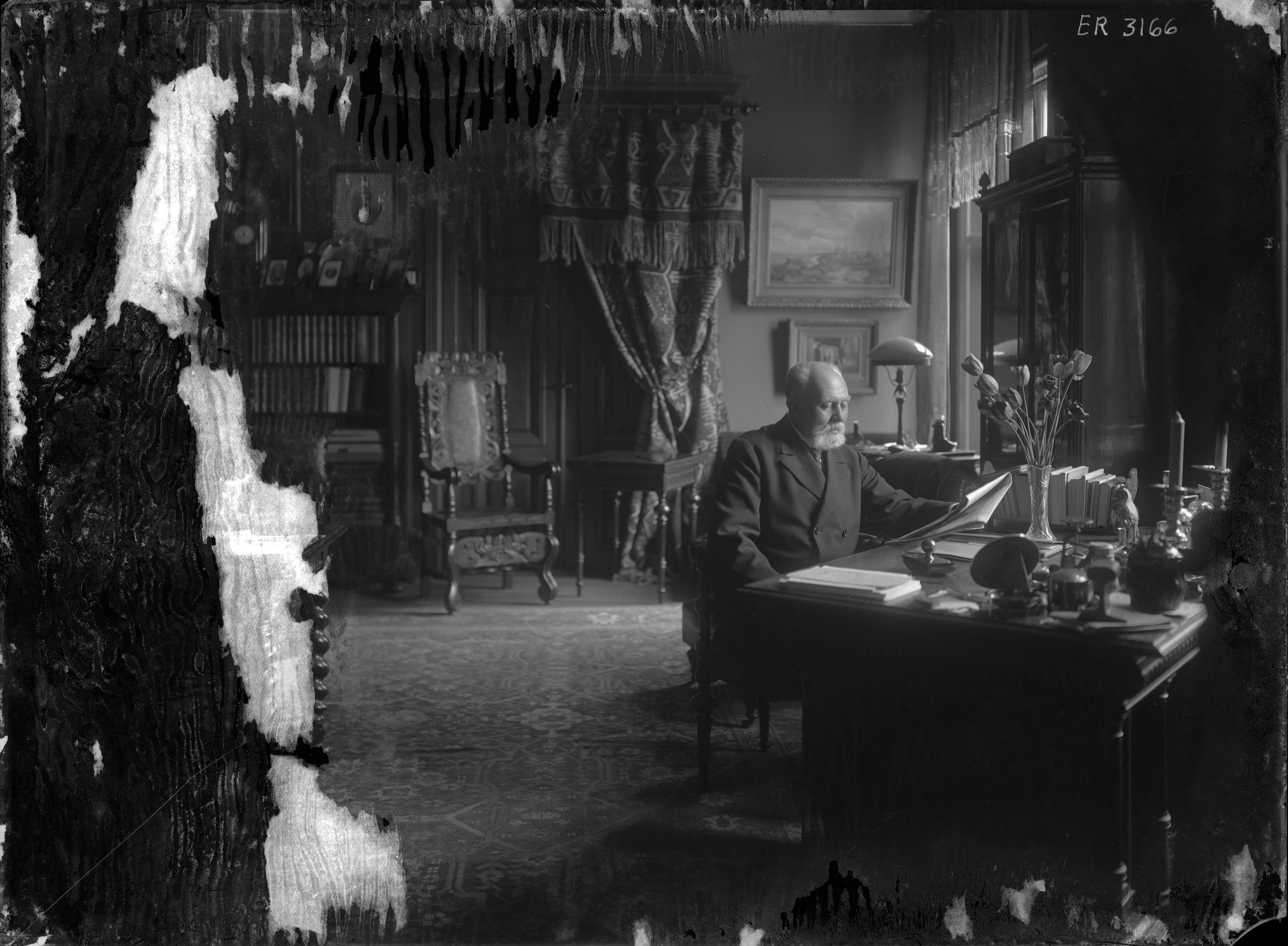 Porträtt i rumsinteriör av grosshandlare Cornelius Faxe, sittande vid skrivbord, läsande tidning i sitt hem på Södergatan 22.