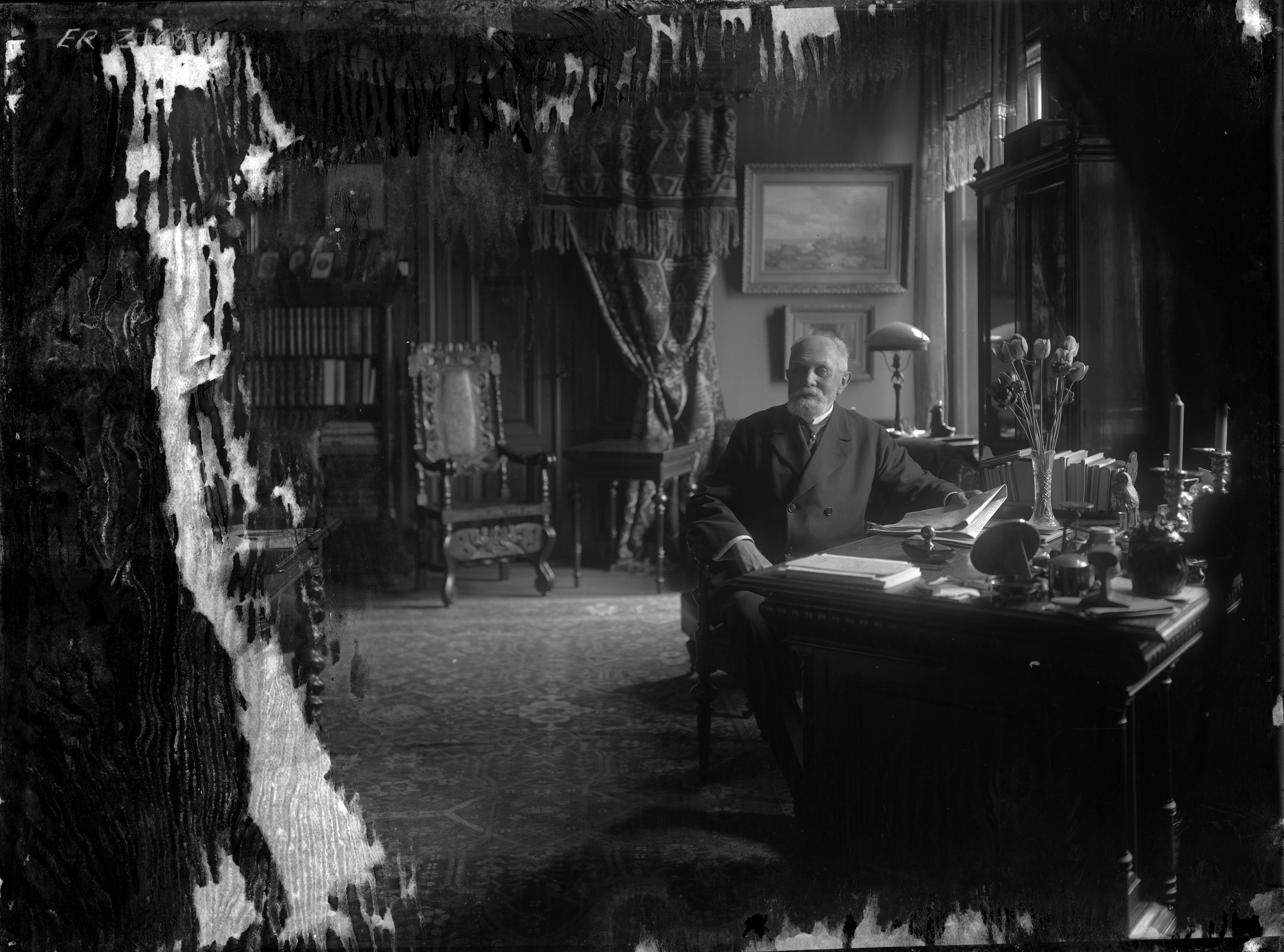 Porträtt i rumsinteriör av grosshandlare Cornelius Faxe, sittande vid skrivbord, i sitt hem på Södergatan 22.