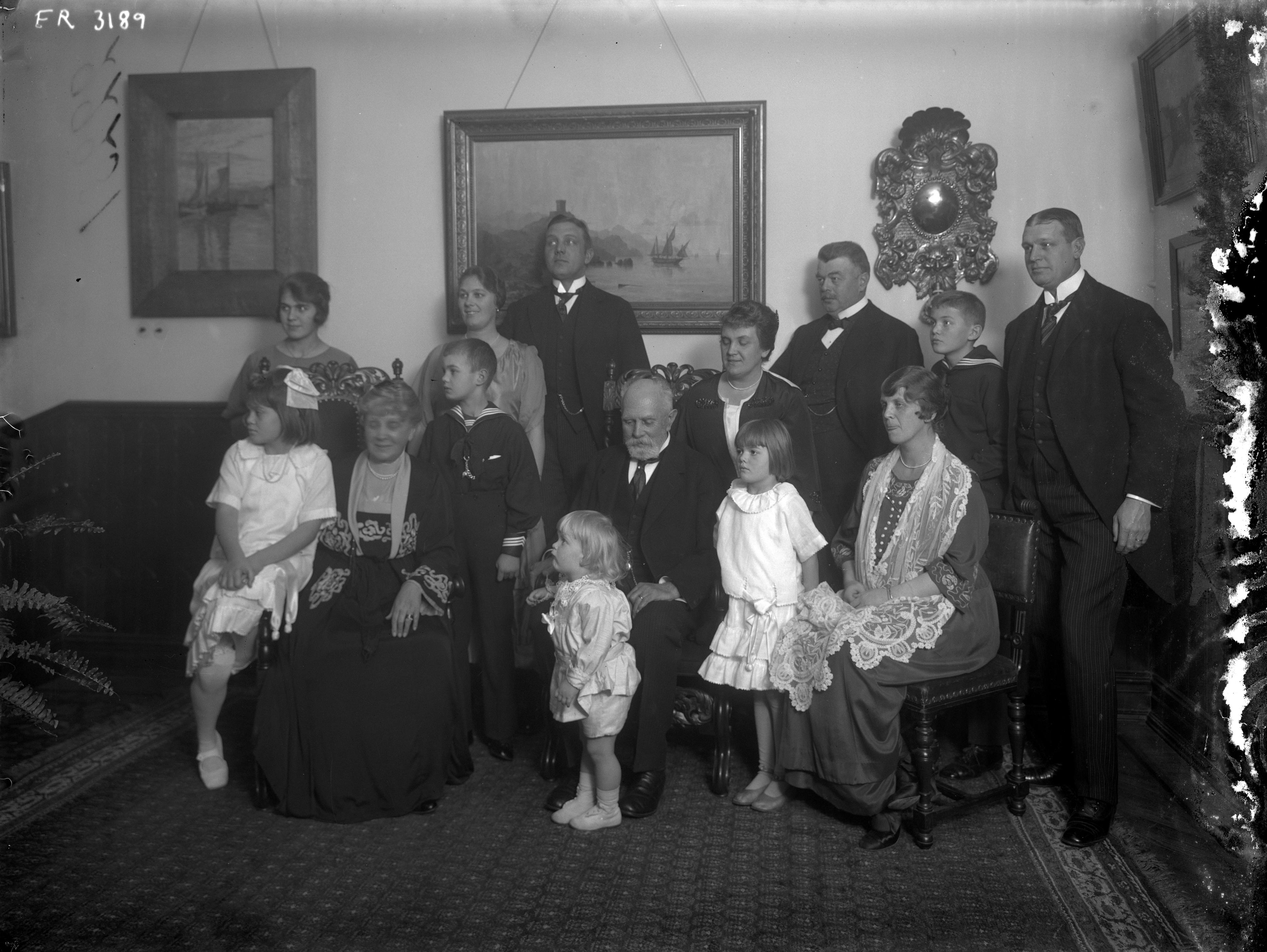 Grupporträtt av grosshandlare Cornelius Faxe med frun Gerda och övriga failjemedlemmar i rumsinteriör.