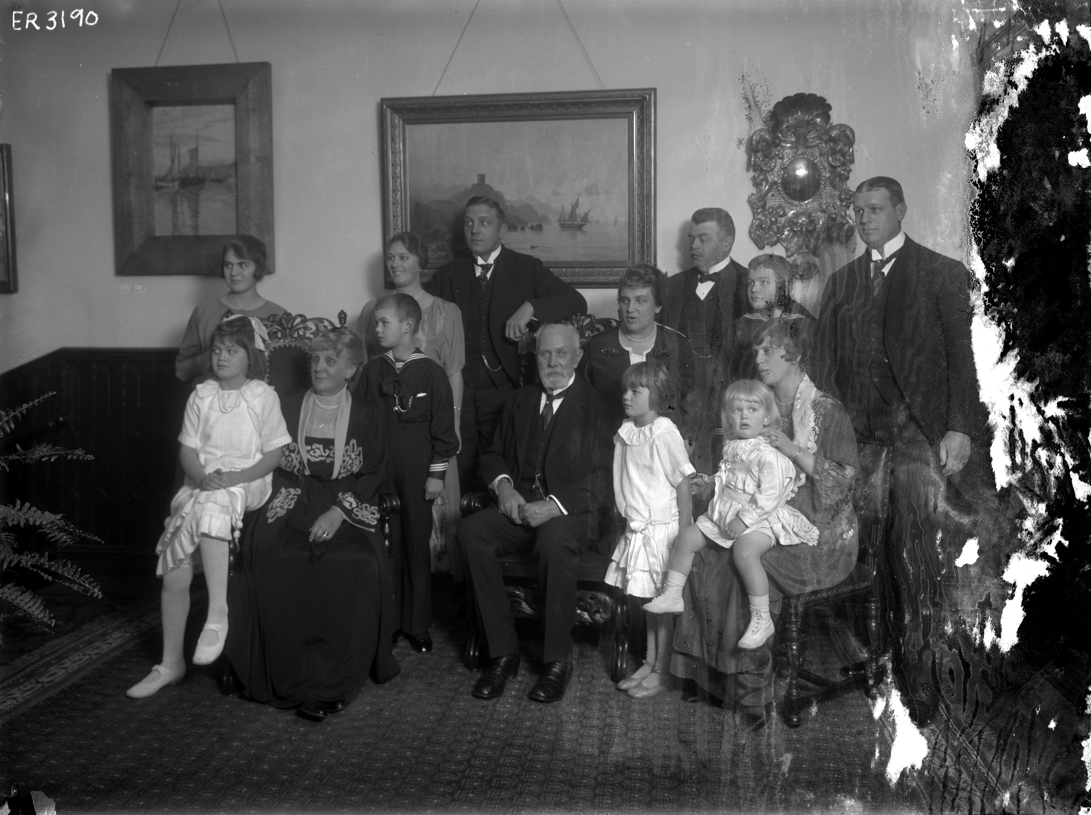 Grupporträtt av grosshandlare Cornelius Faxe med frun Gerda och övriga failjemedlemmar i rumsinteriör.