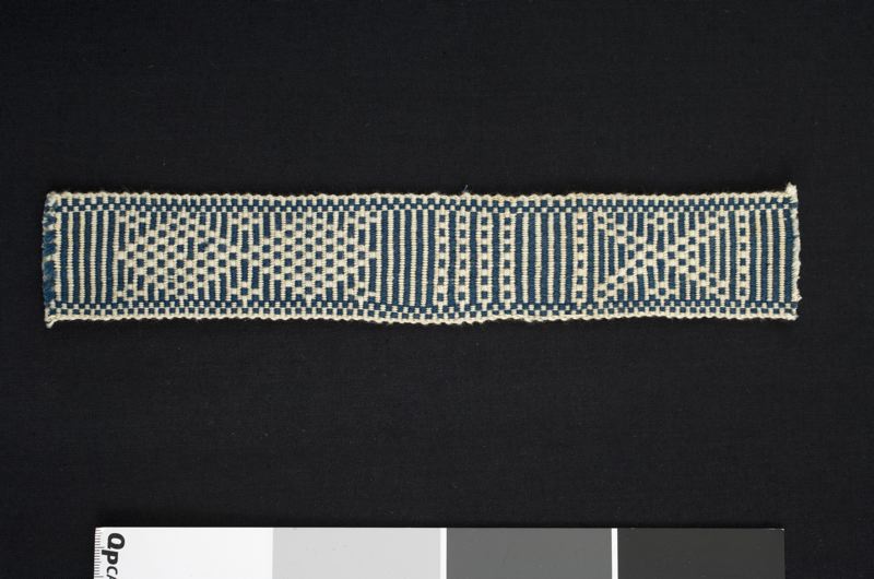 Band av kraftigare kvalité, vävt av blått och vitt bomullsgarn. Mönster med rutor, romber, kryssornament och tvärgående ränder i blått mot vit botten. Utmed kanterna små rutor i blått.