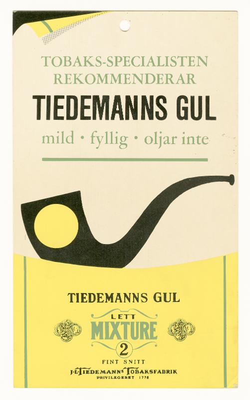 Reklamskylt för Tiedemanns Gul tobak. Skylt av hård papp, vit bakgrund. Mitt på skylten en svart pipa med en stor gul fylld cirkel. Överst står det: Tobaks-specialisten rekommenderar Tiedemanns Gul mild fyllig oljar inte. Längs ner är ett gult tobakspaket avritat med texten: Tiedemanns Gul Lett Mixture 2 Fint snitt J.L. Tiedemanns Tobaksfabrik Privilegeret 1778.