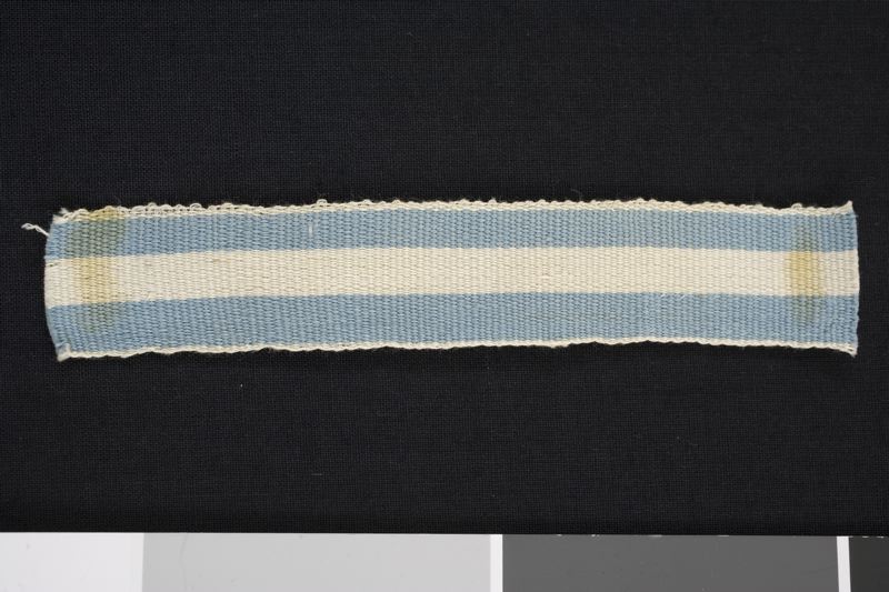 Band, vävt av ljusblått och vitt bomullsgarn. Mönster med tre längsgående ränder, den mittersta vit.