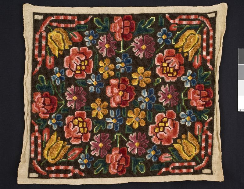 Nysydd stolklädsel, sitsen. Sydd i korssöm med ullgarn och silke på linnetvistbotten. Mittblomma i rödrosa toner omgiven av en krets gul-bruna och blå blommor, däromkring en krets med större rödrosa och mindre rödvioletta blommor. Ytterst i hörnen rödrosa ornament och brungula "tulpaner", mitt på sidorna röda blommor omgivna av gröna blad. Botten mörkbrun. Här och var i blommorna gult och vitt silke.