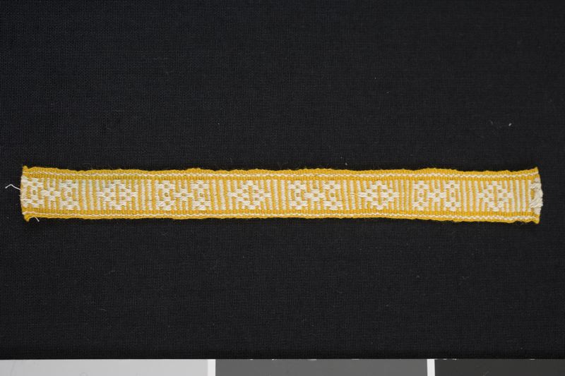 Band, vävt av gult och vitt lin- och/eller bomullsgarn. Mönster med rutade kryss och romber samt tvärgående ränder i vitt mot gul botten, utmed kanterna en rand i vitt.