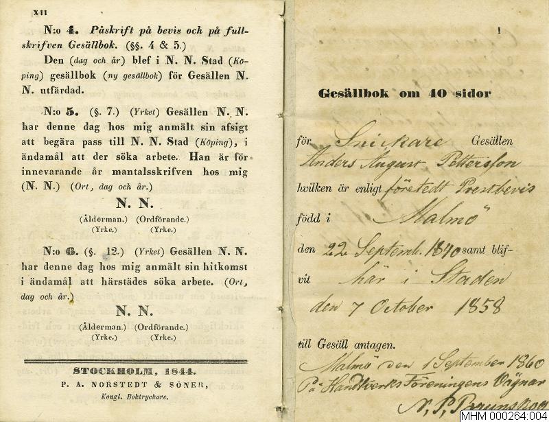 Gesällbok för Anders August Pettersson.