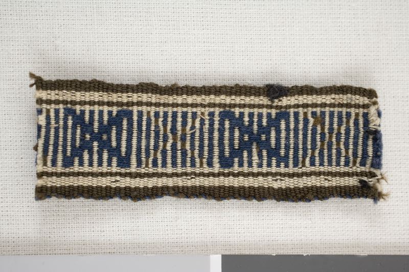 Band, vävt av mörkblått, mörkbrunt och vitt bomullsgarn. Mönster med tvärgående ränder och kryss i nämnda färger. Utmed kanterna längsgående ränder i vitt och mörkbrunt.