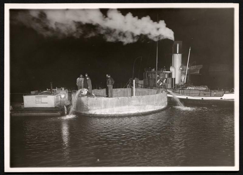- Märkligt nattarbete i Malmö hamn. Natten till söndagen företogs ett egendomligt bogseringsarbete i Malmö hamn. En av de båda väldiga cementburkarna, som blivit gjutna i den då ännu icke vattenfyllda industrihamns bassäng, och som skola utgöra ytterskalet till, i ena fallet pirhuvudet vid oljehamnen och i andra fallet ett liknande fundament vid frihamnen, bogserades ut för att ställas på sin plats, där det sedan skall fyllas med betong för att bliva en fast stödjepunkt i hamntrafiken. Den väldiga kolossen som mäter 8,75 meter i höjd och 3 meter i diameter, släpades ut av hamnens bogserångare. Bogseringen gick lyckligt och fundamentet står nu på sin plats.