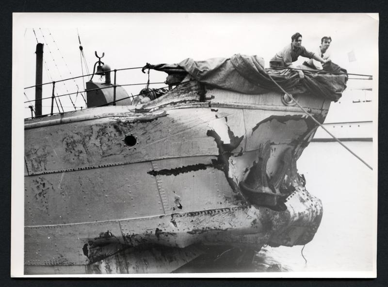 - Fartygskatastrof vid Trelleborg. ”Bojan” i Trelleborgs hamn efter kollisionen med ”Bonita”. Fartygets stäv är alldeles intryckt.