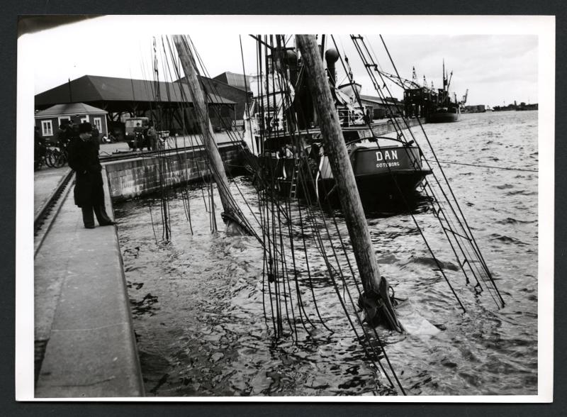 Sjunket skepp i hamnen. Man tittar ner på vraket.