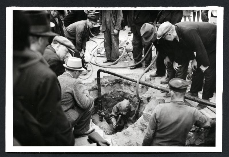 - Gasskyddsdemonstration. Gasverket hade på onsdagen anordnat en demonstration i gasskydd för stadens entreprenörer vid arbetsplatsen intill S:t Petri kyrkplan, där stora gasledningsarbeten för närvarande pågår. – Bilden visar en gasmaskförsedd arbetare i färd med att koppla gasledningsrören.