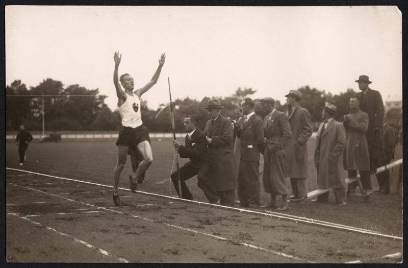 Gruppfoto. Idrottsmän på löparbana, funktionärer. Vykort. - Okänd år