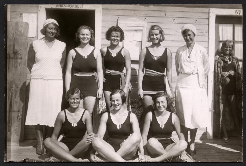 Grupporträtt, 9 kvinnor varav 6 i baddräkt.