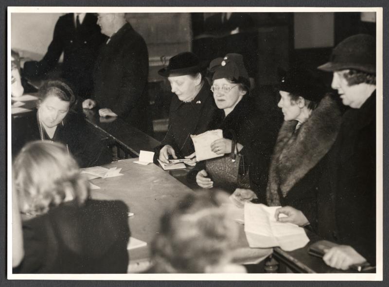 Grupporträtt. En grupp människor som står i kö vid en disk. - Okänd år