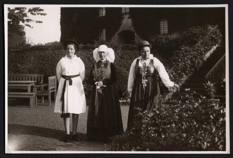 Gruppbild. Utomhusmiljö. Tre kvinnor iklädda folkdräkter. - Okänd år