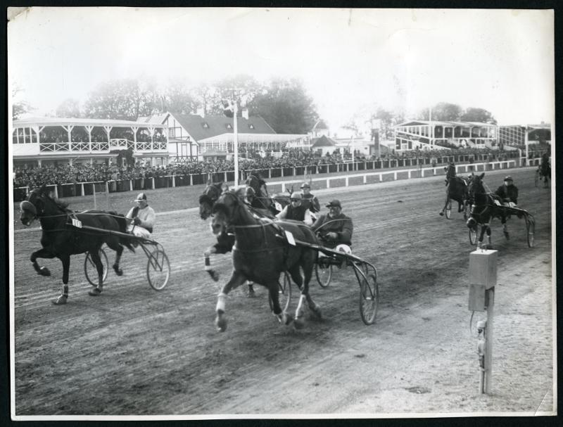 Travlöpningar på Jägersro. IV Jubileumslöpning, 2200 meter. "Kickan" leder fältet efter första varvet.