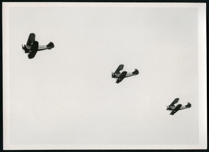 Flygdagen i Malmö. Trenne militärflygare utföra bombanfall mot "staden".