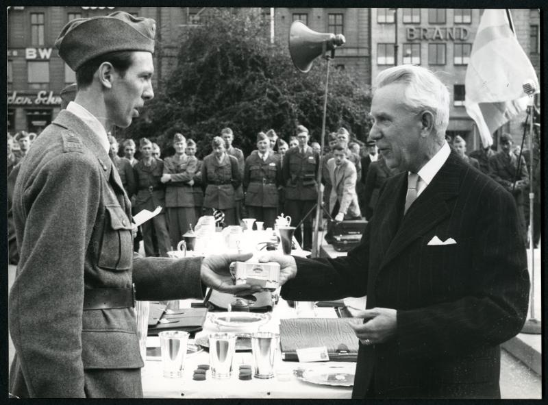 Malmö den 16-8 1951. Malmö BUF prisutdelning på Stortorget. Landshövding A. Thomson förrättar prisutdelning.