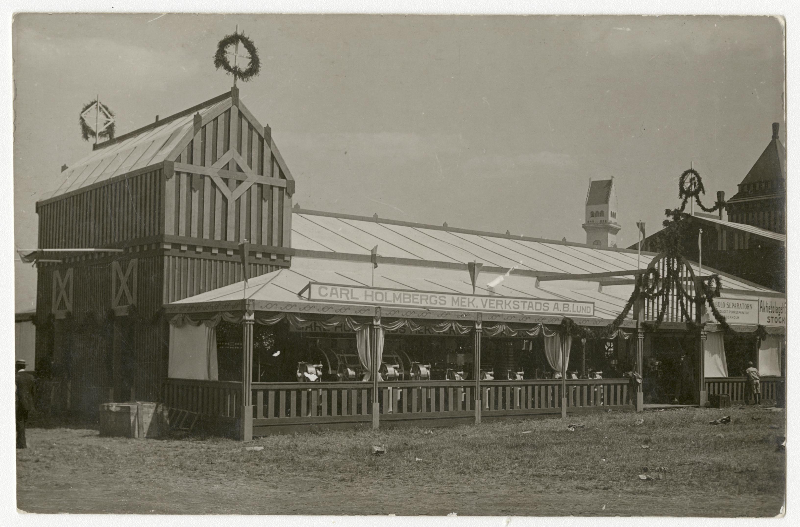 Utställning. Carl Holmbergs mekaniska verkstad AB Lund. Exteriör stora tornet i bakgrunden m. fl.