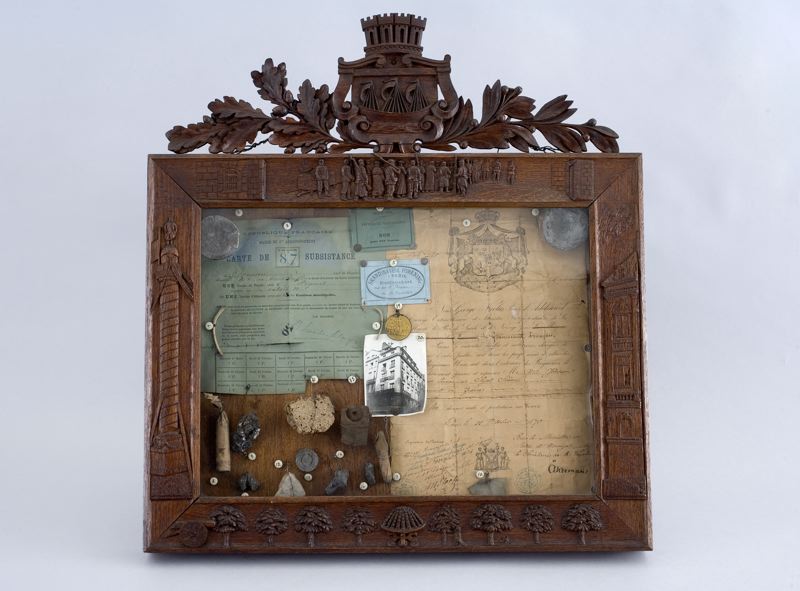Souvenirsamling från fransk-tyska kriget 1870-1871. 18 olika minnesföremål från belägring m.m. placerade i glasförsedd, skulpterad ekram. På baksidan beskrivning av de olika föremålen.