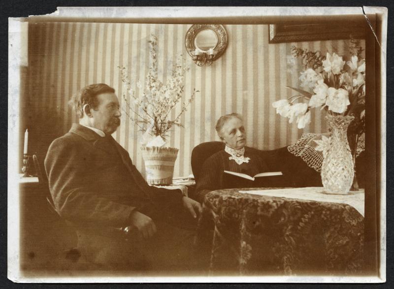 Grupporträtt. Heminredning. Inomhusmiljö. En äldre man och kvinna.