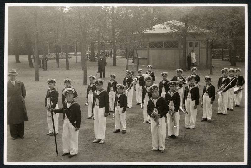 En grupp uniformsklädda pojkar med blåsinstrument i handen. En av pojkarna har ett tygband tvärs över bröstet där det står "Folkets park" i bakgrunden träd och en liten paviljong.
