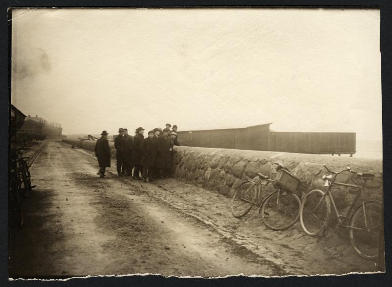 En grupp människor står vid en skyddsmur och tittar ner. Där Nilsson hoppar över parapeter. 1920-talet.