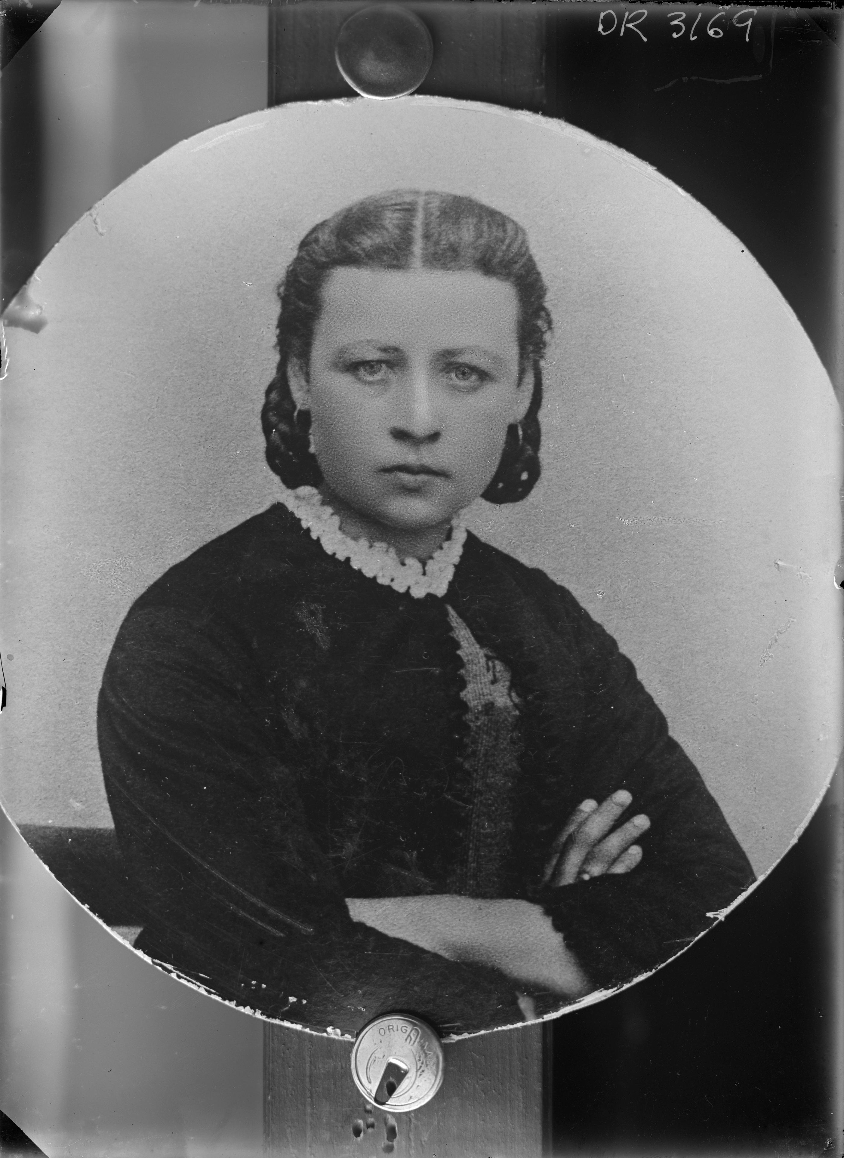 Porträtt i halvfigur av oidentifierad kvinna. Reprofotografi beställt av disponent Emil Malmsten (1875-1940).