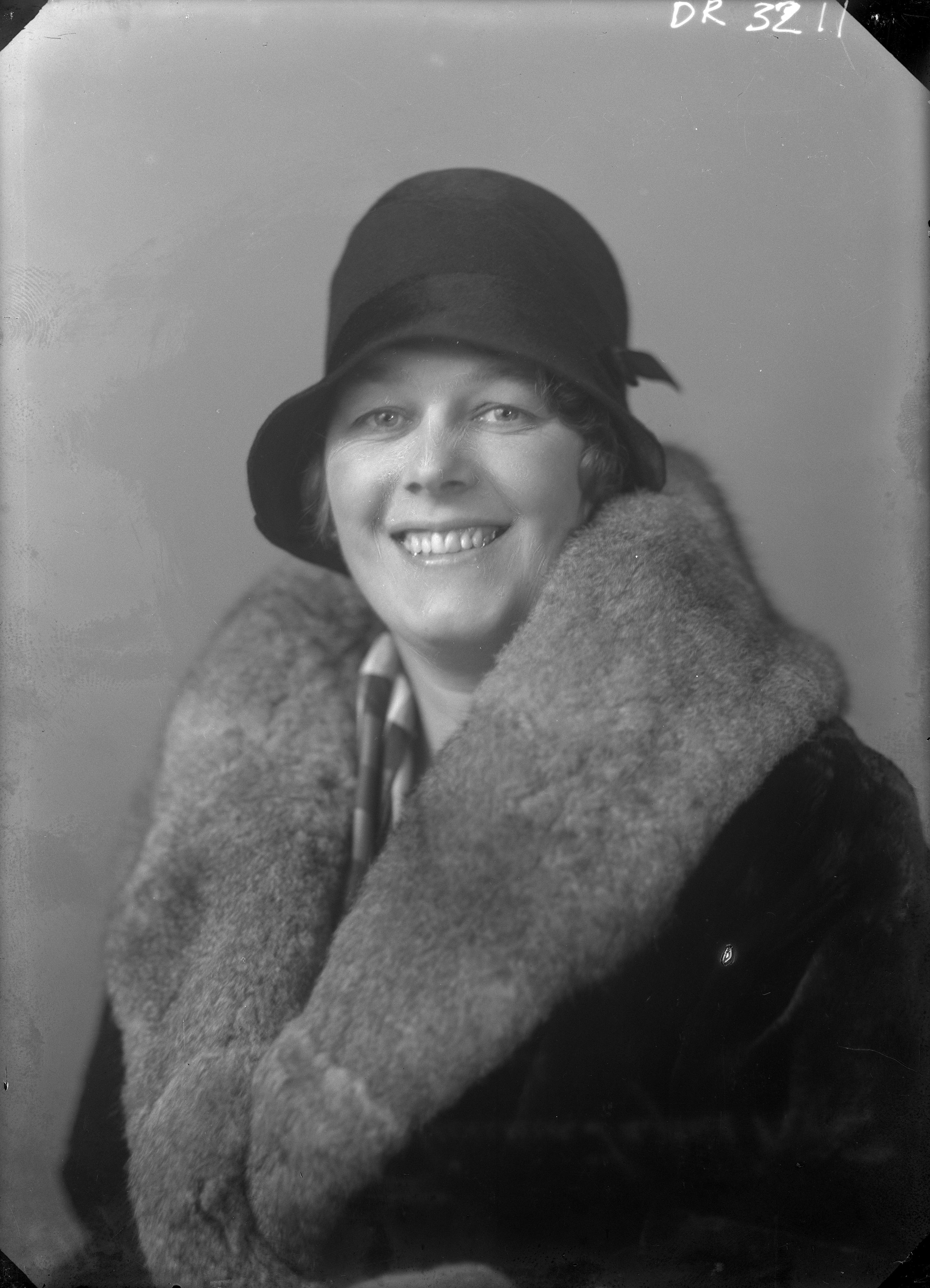 Porträtt i halvfigur av Ingrid Faxe, iklädd hatt och kappa med päls.
