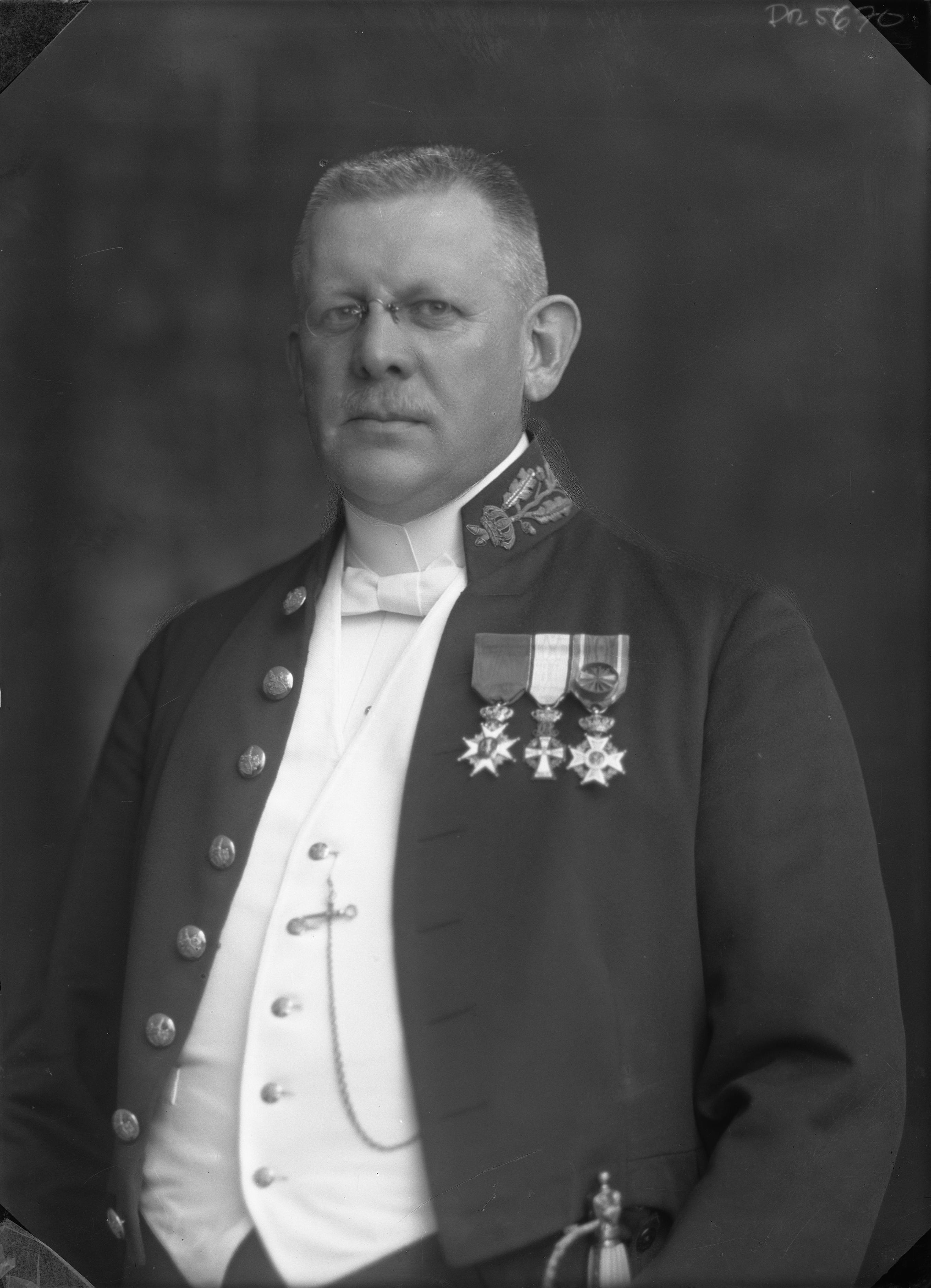 Porträtt av polismästare Yngve Schaar, iklädd uniform med ordnar på rockslaget.