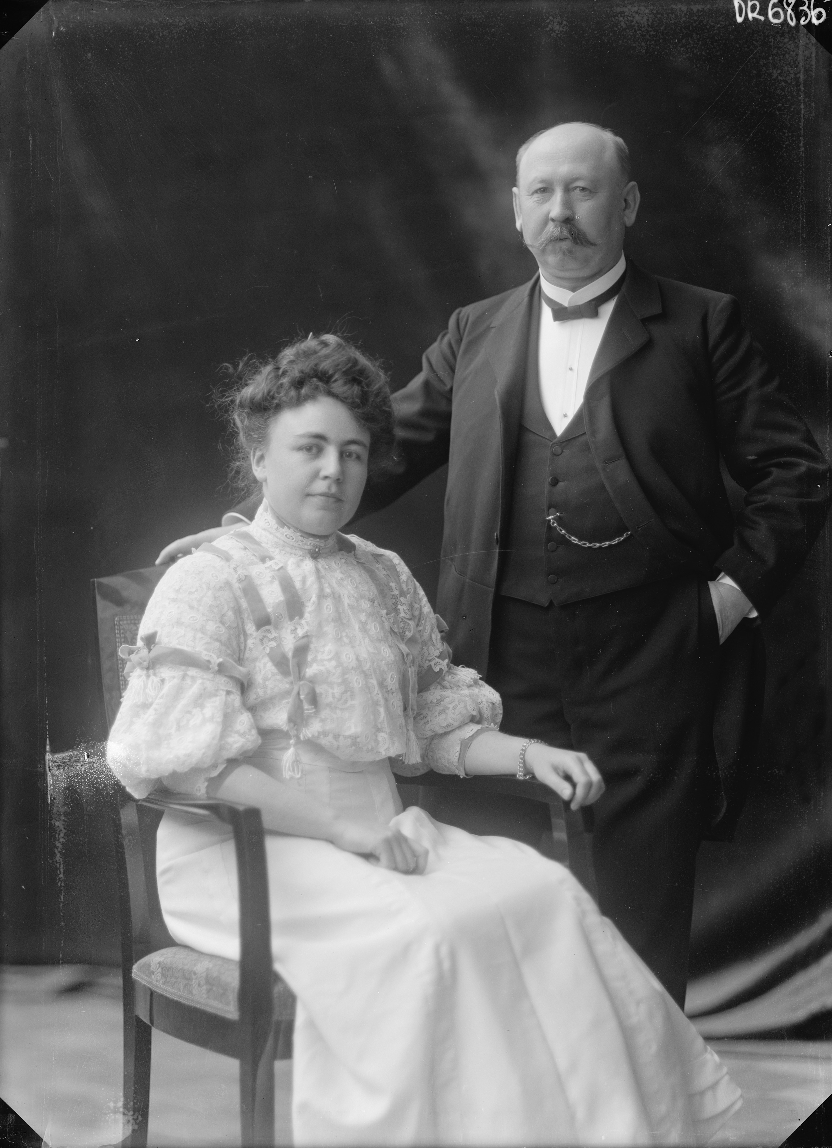 Porträtt i helfigur av grosshandlare Hugo Lindgren med frun Anna. Frun sittande i stol.