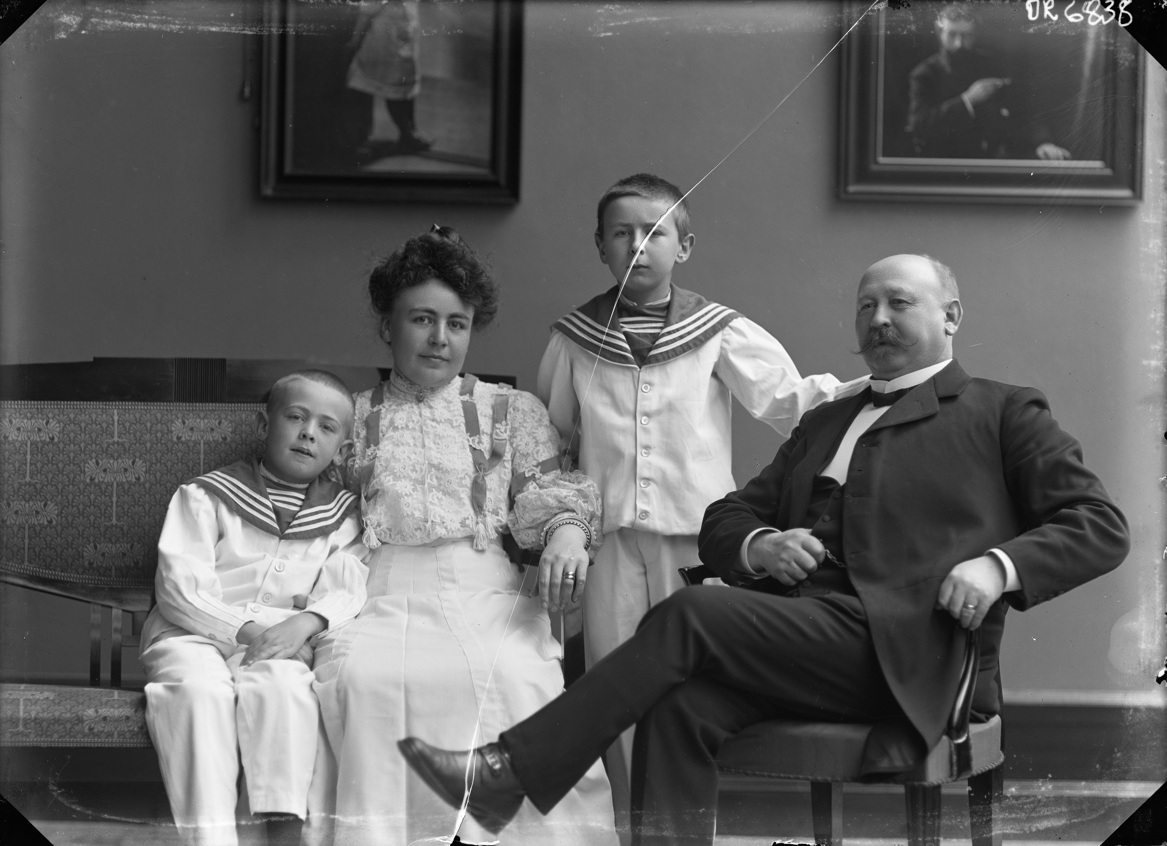 Porträtt i helfigur av grosshandlare Hugo Lindgren med familj.