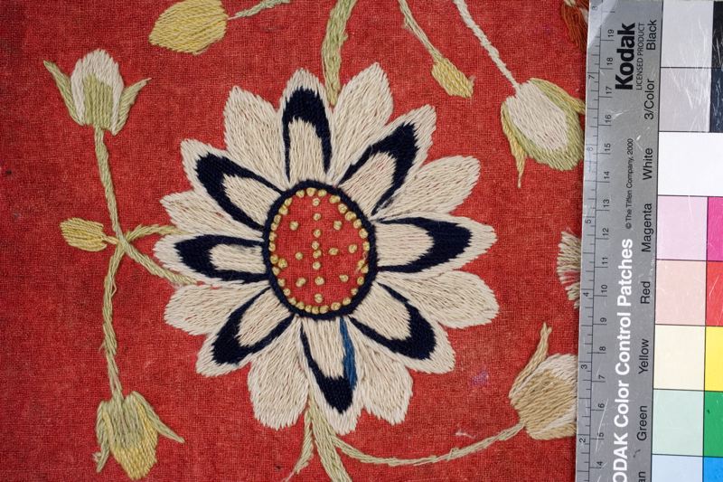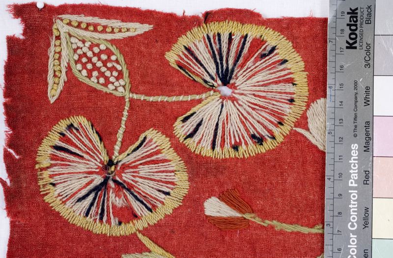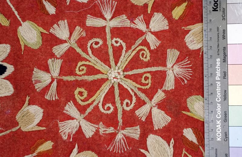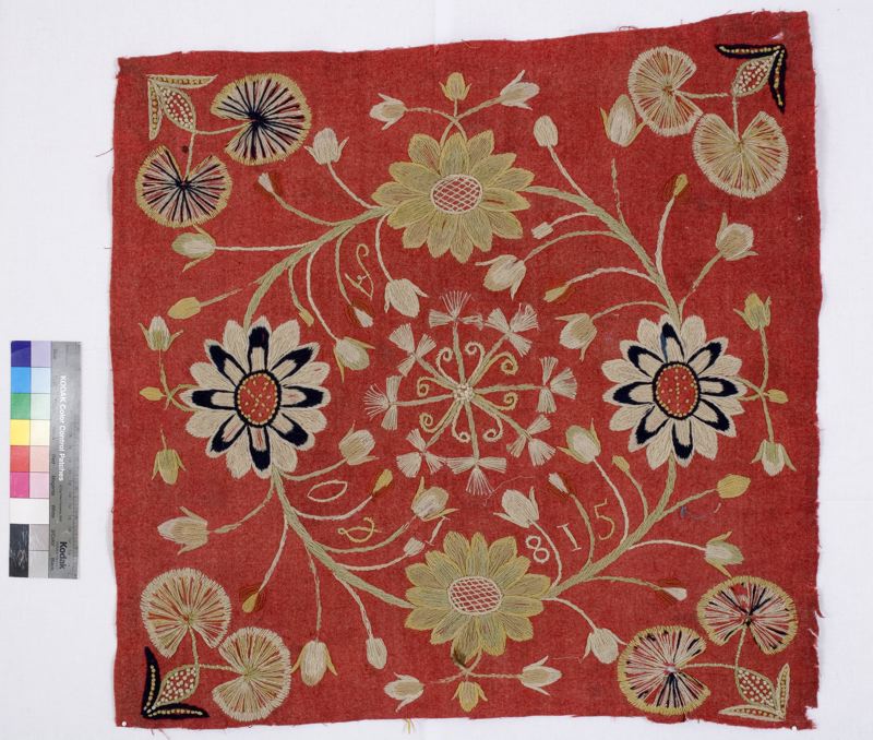 Jynne, röd vadmal med broderier i schattersöm av ullgarn i flera färger:
