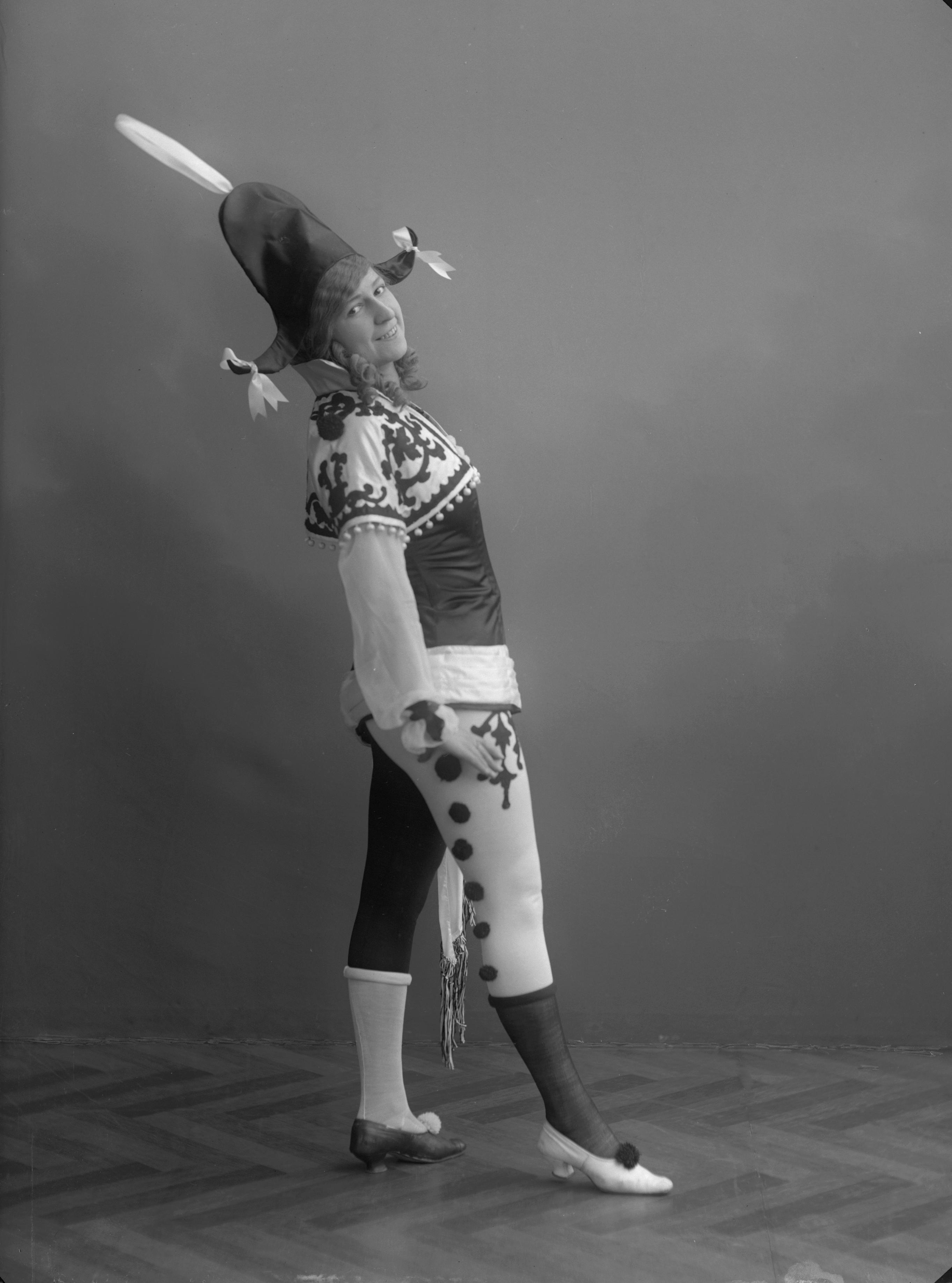 Porträtt i helfigur av medlem ur Lianders teatersällskap.
