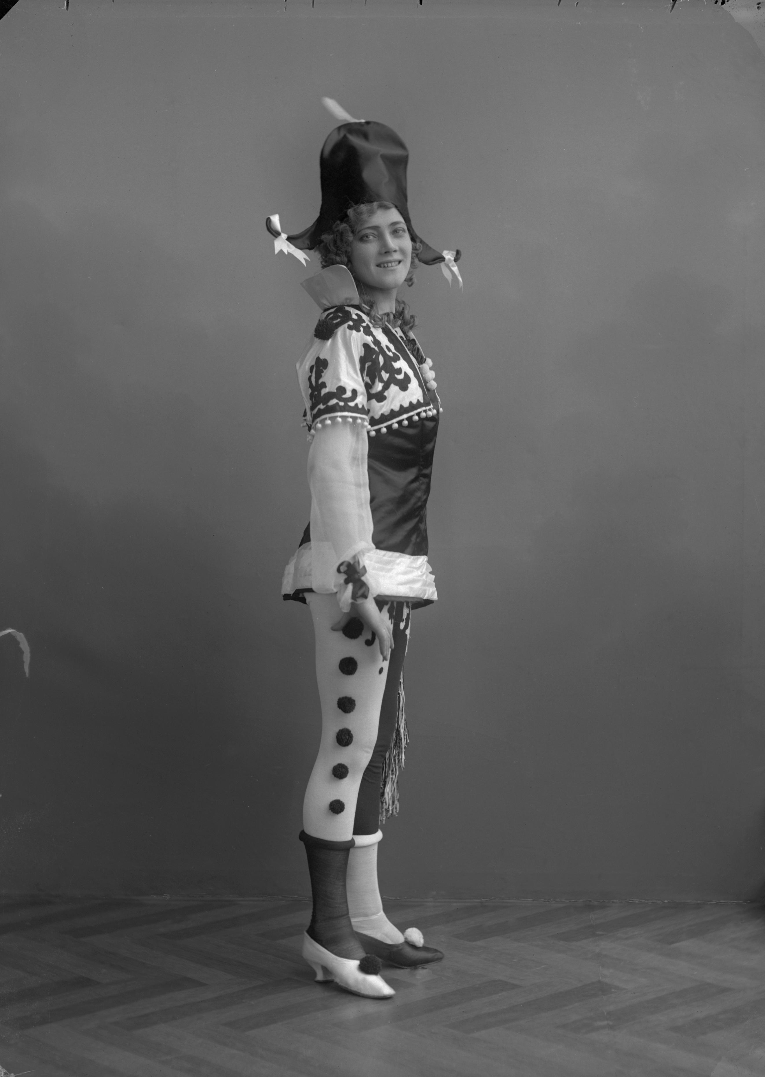 Porträtt i helfigur av medlem ur Lianders teatersällskap.